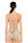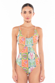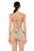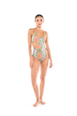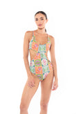 Enterizo tipo cut out con copas removibles, cargaderas ajustables y recogido en los costados que realza la silueta. Su cobertura moderada y tela con sutil brillo lo convierten en una pieza llamativa y sofisticada. Perfecto para destacar en la playa o junto a la piscina con estilo único.