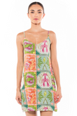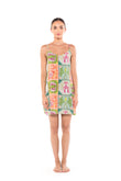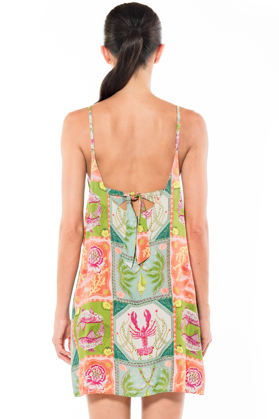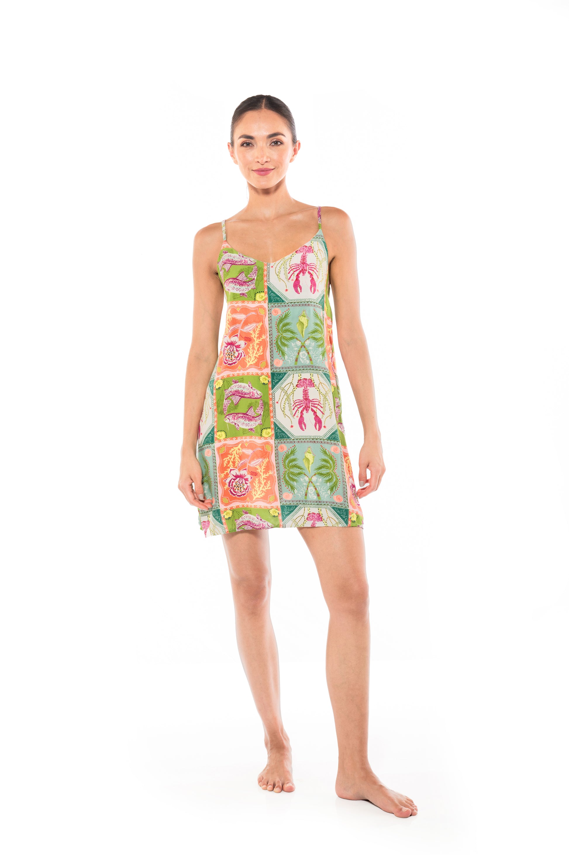Vestido corto de talla única con tiras delgadas y ajuste en la espalda mediante una chapola, que permite adaptarlo cómodamente al cuerpo. Su silueta suelta y liviana lo hace ideal como salida de baño o como vestido para un look relajado. Perfecto para días cálidos, paseos junto al mar o tardes de verano.