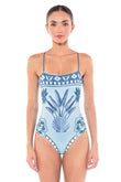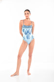 El Carla One Piece es un clásico atemporal con un diseño limpio y femenino. Su silueta ofrece cobertura media, con copas removibles y cargaderas ajustables para un fit cómodo y versátil. El print localizado en tonos azules tropicales y los detalles de apliques aportan personalidad y estilo.
