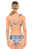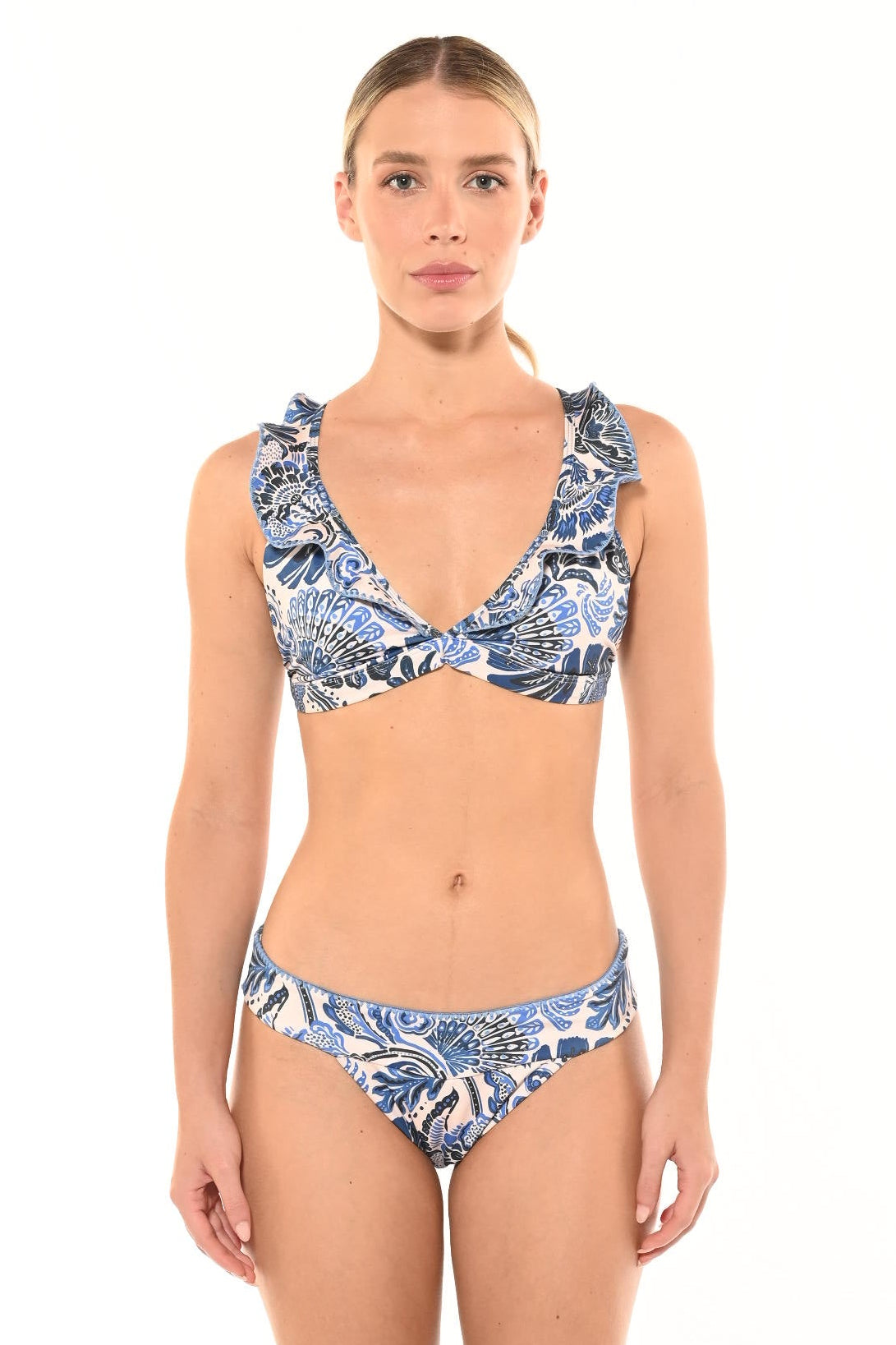 El Top Ángela Ocean Escape combina feminidad y elegancia náutica en una silueta clásica y favorecedora. Su triángulo fijo brinda un ajuste cómodo y seguro, mientras que el bolero bordado en los tirantes aporta un detalle delicado y cómodo.