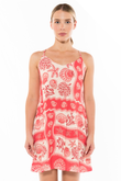 Vestido corto de talla única, con tiras delgadas y ajuste en la espalda mediante una chapola que permite adaptarlo cómodamente al cuerpo.